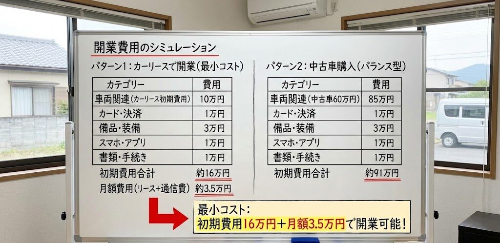 A. カーリースなら初期費用16万円+月額3.5万円で開業可能。中古車購入なら約90万円必要です。