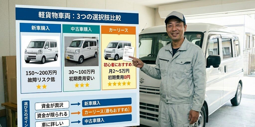 A. 初心者はカーリースがおすすめ。理由:初期費用が圧倒的に安い、黒ナンバー取得代行付き、故障リスクなし。