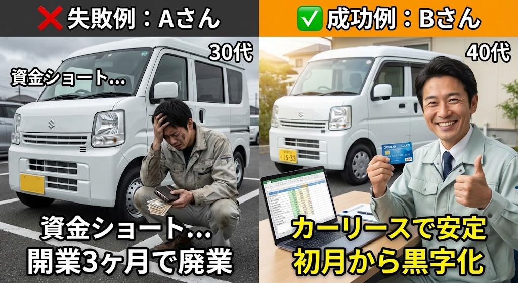 A. いいえ、最初はカーリースがおすすめです。理由:初期費用が圧倒的に安い、故障リスクなし、黒ナンバー取得代行付き。事業が軌道に乗ってから購入を検討しましょう。