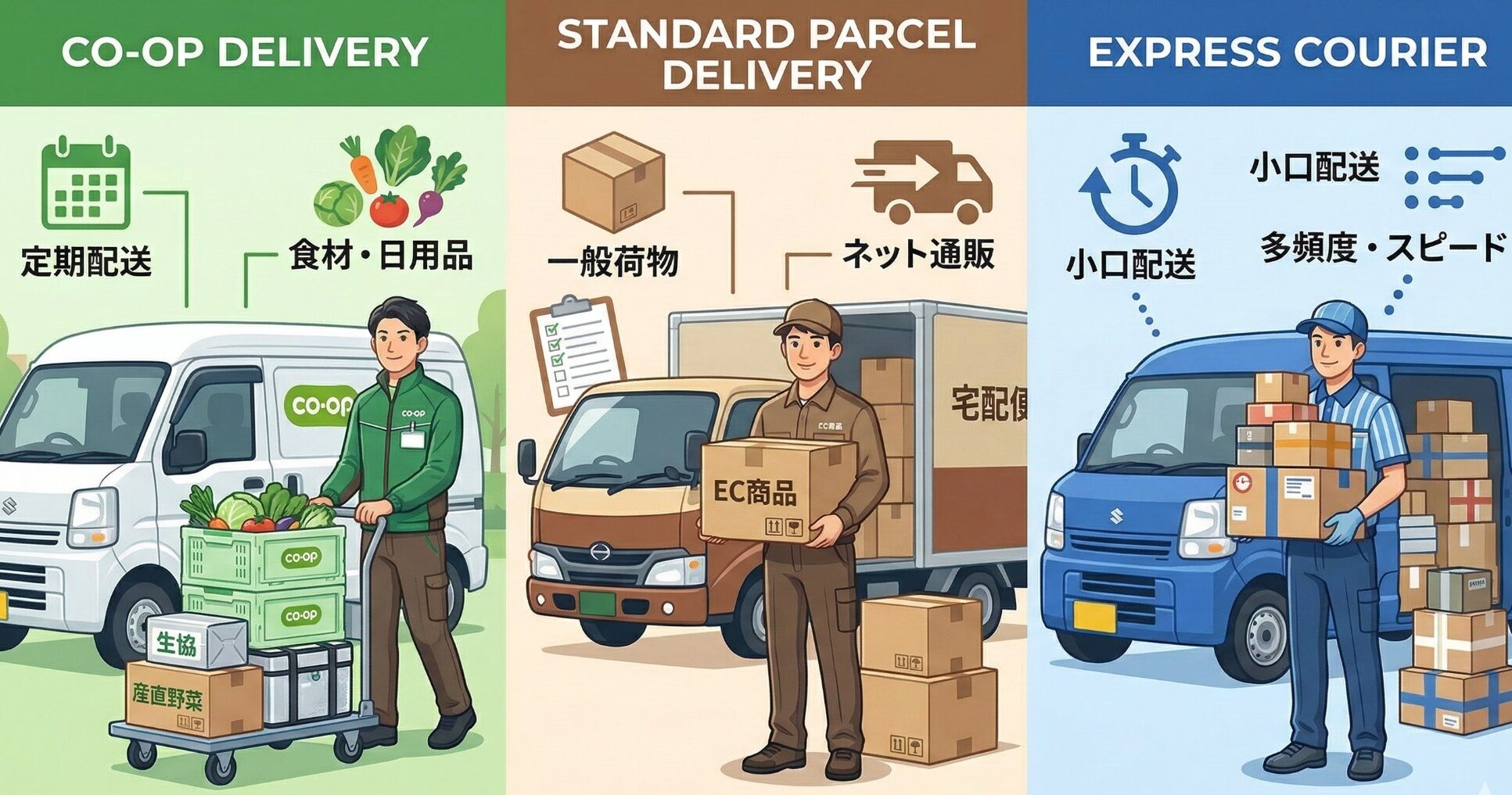 生協自体が直接ドライバーを雇用するケースと、物流会社・委託会社を通じて個人の軽貨物ドライバーに仕事を発注するケースの両方があります。軽貨物の個人事業主として参入する場合は、生協の物流を請け負う委託会社との契約が一般的な入口です。