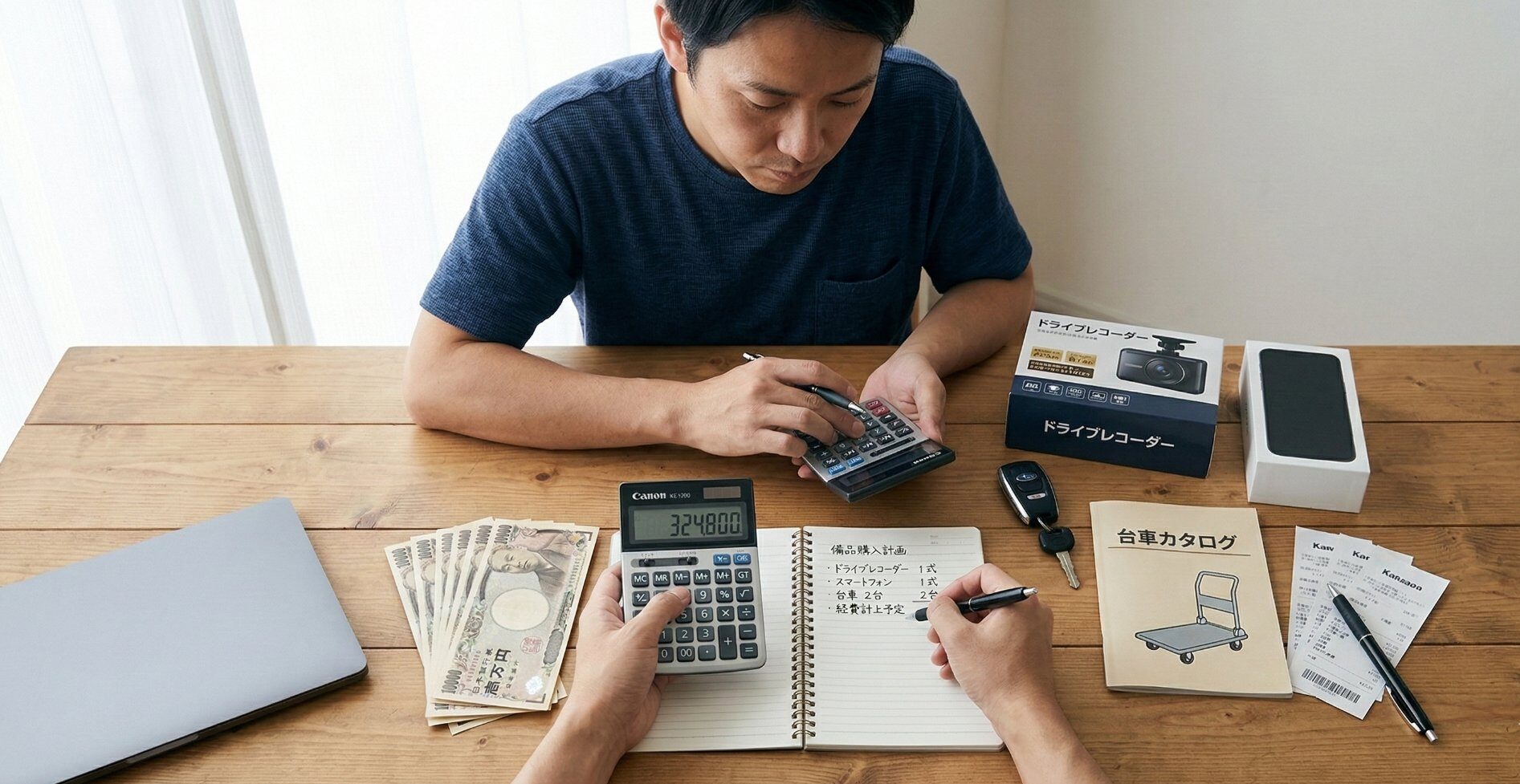 例えば、スマートフォン(15万円)・ドライブレコーダー(3万円)・台車(2万円)を購入した場合、合計20万円を購入年に全額経費にできます。翌年以降に分けて経費化するより、早めに節税効果を得られます。